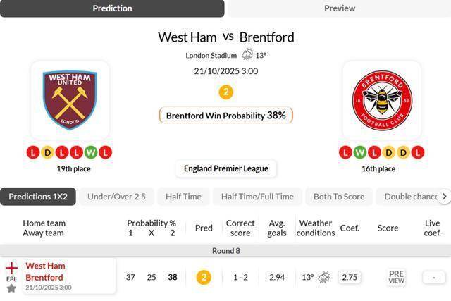 在最近8次对阵西汉姆联的英超比赛中,布伦特福德有7场保持不败。