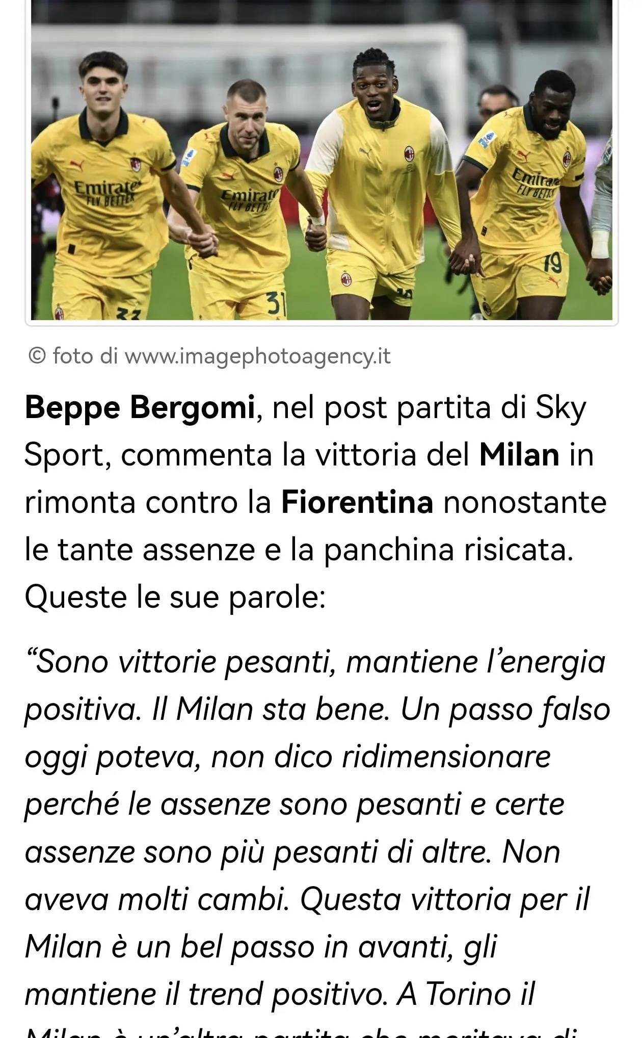 贝佩·贝尔戈米在天空体育的赛后节目中,点评了米兰在多名球员缺阵、替补席阵容单薄的情况下,逆转击败佛罗伦萨的这场胜利: