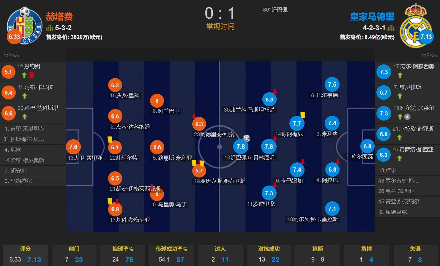 在阵容方面,赫塔费采用了532的防守阵型,首发球员身价为3620万欧元。而皇马的主帅安切洛蒂则排出了4231的阵型,姆巴佩担任前锋,贝林厄姆在他身后,左右两翼分别是罗德里戈和马斯坦托诺。中场由卡马文加与琼阿梅尼搭档,后防线是卡雷拉斯、阿拉巴、米利唐和巴尔韦德,门将则是库尔图瓦。皇马的首发阵容总身价达到了8.49亿欧元。
