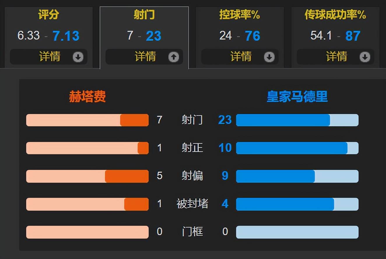 尽管在人数优势的情况下,皇马仅以1-0小胜赫塔费,但这场胜利依然帮助他们暂时以2分的优势重新登顶西甲积分榜。整场比赛,皇马的控球率高达76%,并且一共创造了23次射门机会,其中10次射正;相比之下,赫塔费的7次射门中只有1次射正。