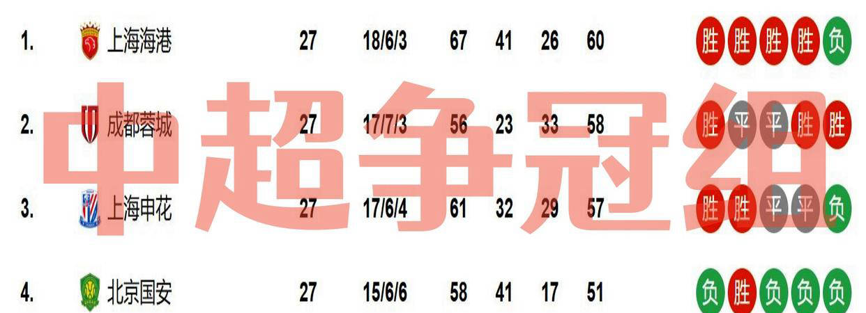 中超第27轮比赛结束后,北京国安客场输给深圳新鹏城,正式失去了争冠资格。三支竞争激烈的争冠球队现在形成了三足鼎立的局面:海港以60分领先,成都蓉城58分紧随其后,上海申花57分排名最末。最后三轮比赛对于这三支球队来说至关重要,丝毫不能有差池,否则就会功败垂成。