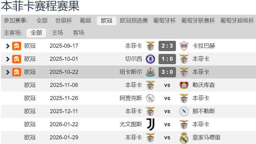 在欧冠联赛阶段第3轮的比赛中,本菲卡客场0-3完败给纽卡斯尔,遭欧冠三连败天崩开局,3场欧冠进2球丢7球。