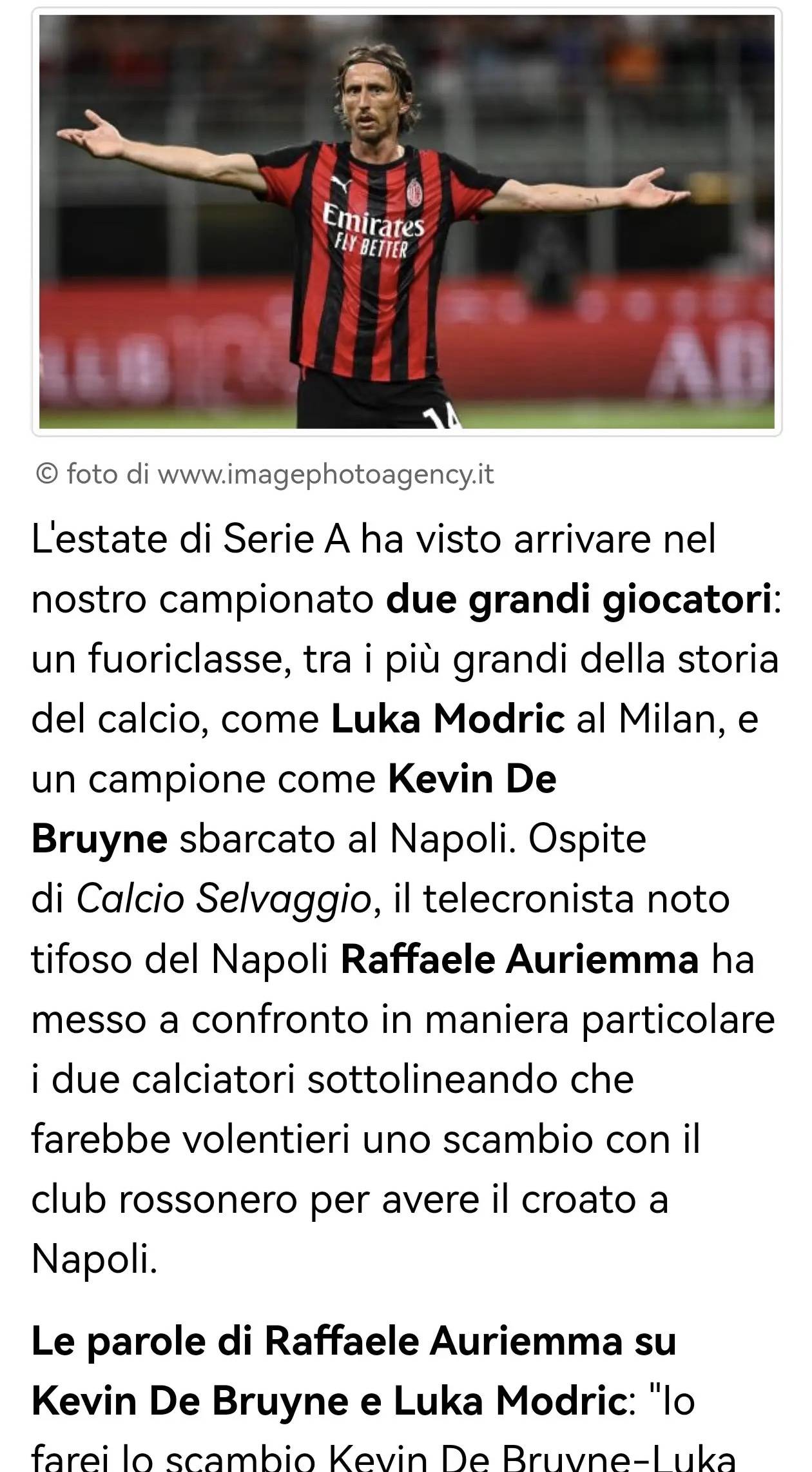 在《狂野足球》节目中,知名解说员、那不勒斯死忠球迷拉斐尔·奥里耶马重点对比了这两名球员,还表示愿意让那不勒斯与米兰进行球员交换,从而将克罗地亚人招致麾下。