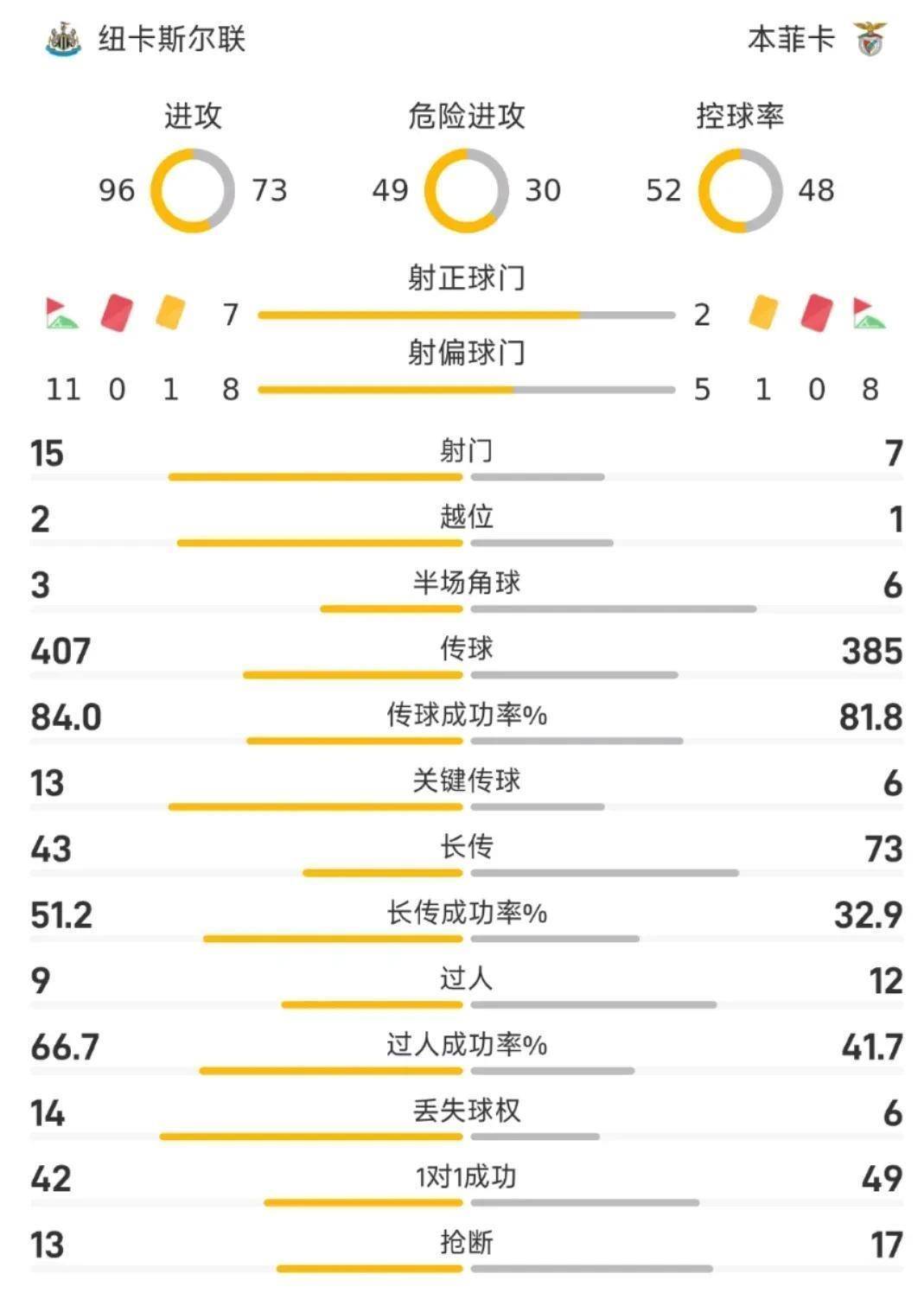 这场比赛在纽卡斯尔的圣詹姆斯公园进行,年轻的英格兰前锋戈登表现出色,贡献了一次助攻和一个进球,凭借其出色的表现当选为全场最佳球员。纽卡斯尔控球率高达65%,射门次数以15-5领先本菲卡,角球数为7-,在场面上占据了绝对优势。