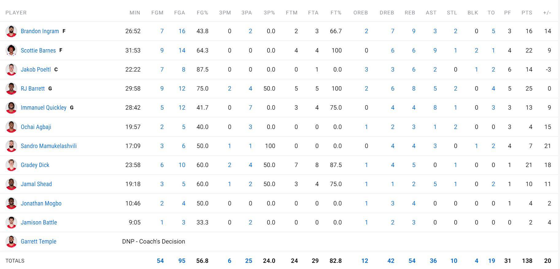猛龙队全队共有7人得分上双,其中3人得分超过20分。替补球员迪克在短短24分钟内,10投6中,高效地贡献了21分。反观老鹰队的当家球星特雷杨,出战34分钟,14投仅5中,三分球7投1中,只得到22分和5次助攻。