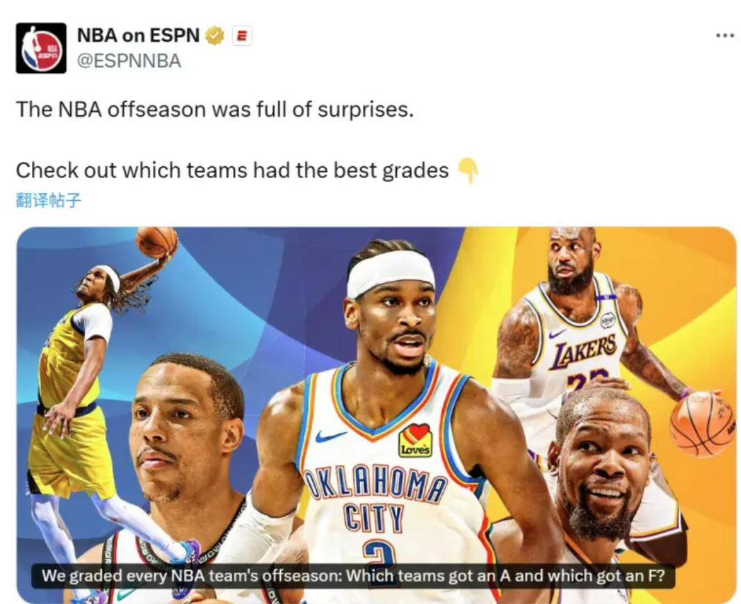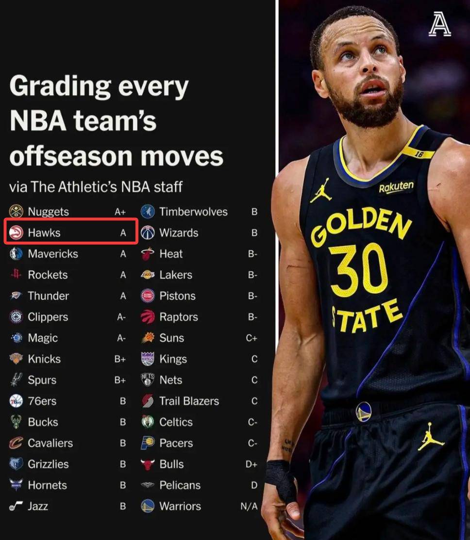 ESPN休赛期运作评级:老鹰A,火箭A,掘金A-。