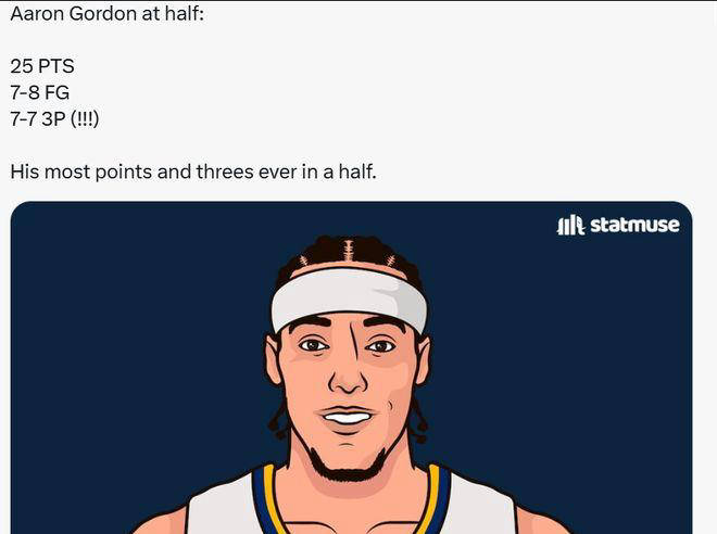首先,在上半场比赛中,戈登7投全中拿下25分,创下了他职业生涯上半场得分最高以及单场三分命中最多的纪录。