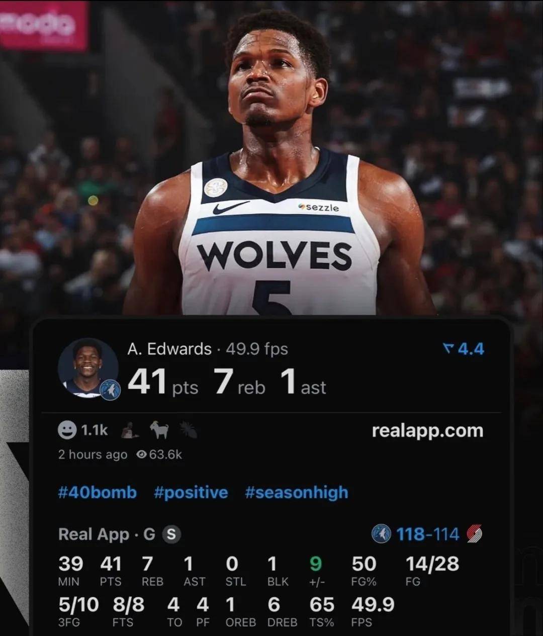 森林狼在新赛季首战以118比114险胜开拓者,安东尼·爱德华兹状态火爆,投篮命中率达到50%,全场拿下41分7个篮板,但仅有一次助攻,显示他在组织球队方面还有提升空间。爱德华兹今年整个夏天都在苦练,唯一的休息时间就是开启了中国行,这也让他新赛季首战便展现出强大的得分能力。这场比赛也是中国球员杨瀚森的NBA常规赛首秀,他出场五分多钟,投篮1中0,罚球2中2,贡献2分1个篮板。篮下面对四届最佳防守球员戈贝尔的勾手被盖,勇敢补防却被麦克丹尼尔斯隔扣,首秀可谓充满挑战。