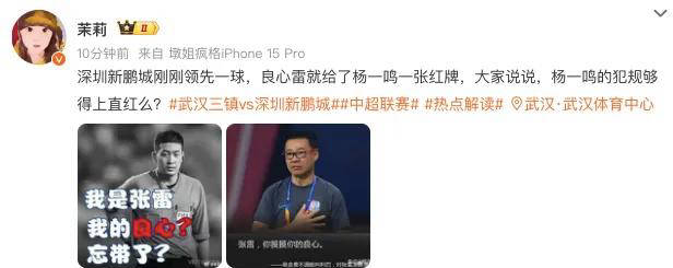 许多网友对此感到愤慨:“相同动作,为何一个是红牌,一个却只是黄牌?”、“张雷分明对深圳有偏见!”甚至新鹏城的跟队记者程文莉也在社交媒体上发文讽刺张雷:“良心忘带了?”