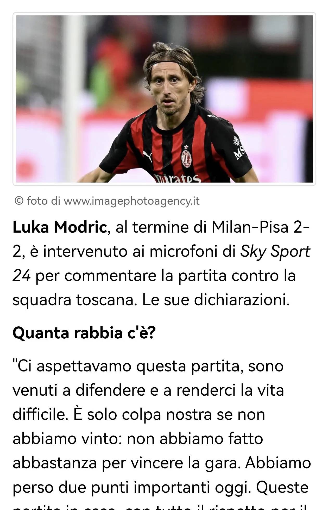 米兰2-2战平比萨后,卢卡·莫德里奇接受天空体育24台(Sky Sport 24)采访: