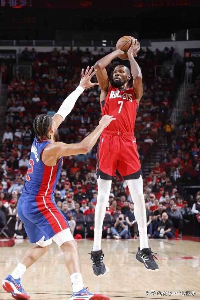 杜兰特仅打了28分钟,18投9中,外线三分球命中率100%,砍下37分。今天的比赛KD大多是迎着两名防守者出手的中距离,尽管命中率不高,却博得了18次罚球命中了16个,第四节球队落后时,杜兰特大手一挥拉开单打稳稳命中三分球帮助火箭追平比分。