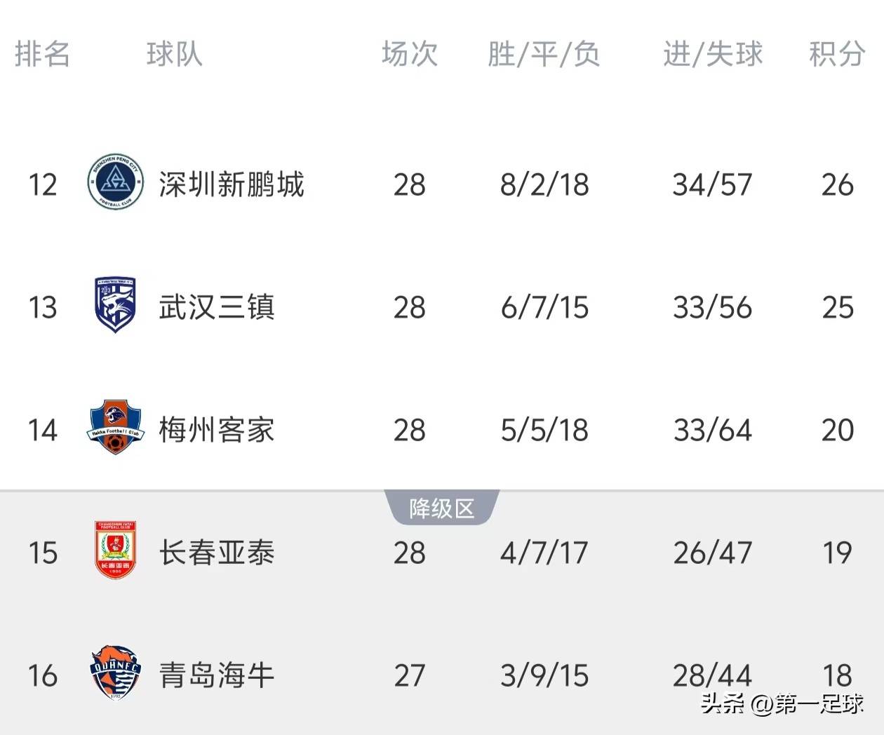 根据最新的积分榜,深圳新鹏城积26分,排名第12,武汉三镇积25分,排名第13,梅州客家积20分,排名第14,长春亚泰积19分,排名第15,青岛海牛则以18分垫底。中超将降级两队,目前来看,这六支球队都有降级的可能。尤其是青岛海牛,他们明晚将客场挑战北京国安,鉴于国安的现状,青岛海牛仍有希望创造奇迹。