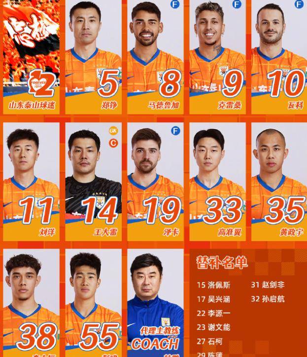 山东泰山 首发球员:王大雷、郑铮、卡扎伊什维利、高准翼、刘洋、克雷桑、黄政宇、泽卡、李小恒、马德鲁加、彭啸