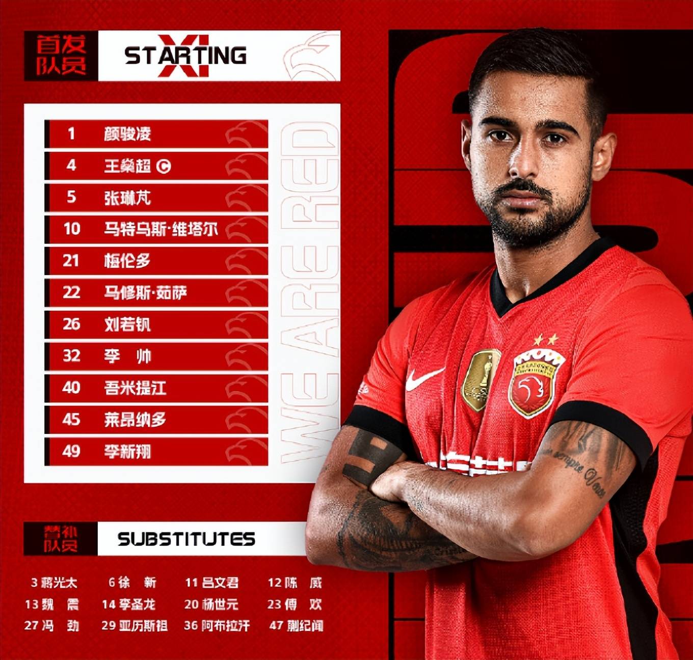 上海海港 首发球员:张琳芃、颜骏凌、王燊超、马特乌斯-茹萨、莱昂纳多、马特乌斯-维塔尔、梅伦多、李帅、刘若钒、吾米提江-玉苏普、李新翔