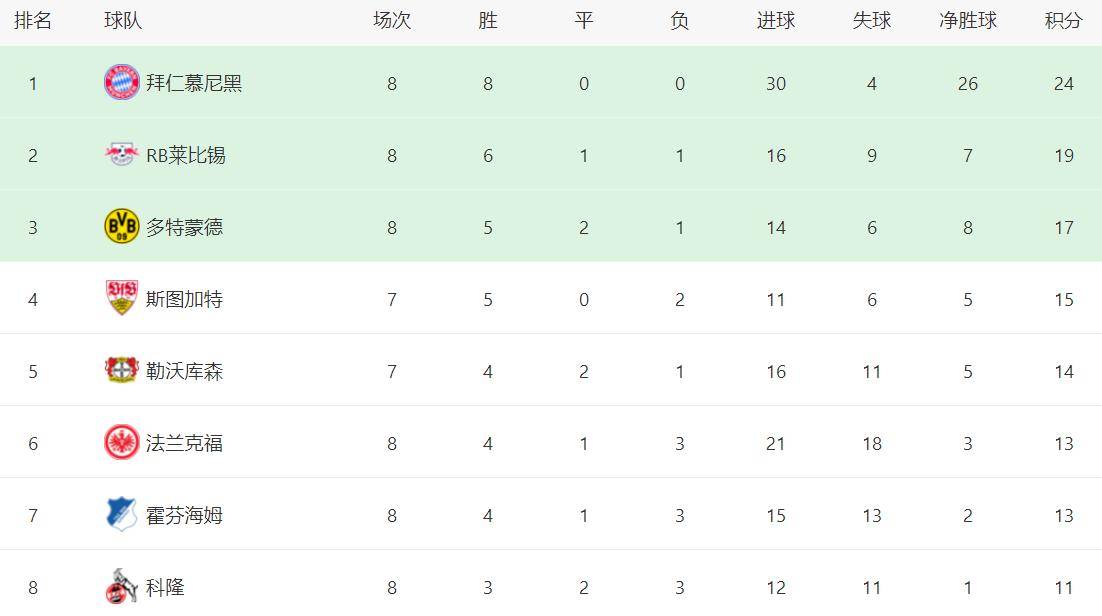 在德甲积分榜上,拜仁凭借着24分稳居榜首,领先第二名的莱比锡5分。莱比锡的战绩为6胜1平1负,积19分。紧随其后的多特蒙德则以5胜2平1负积17分排名第三。斯图加特以15分排名第四,勒沃库森仅以14分排名第五,本赛季的勒沃库森显然无法对拜仁的霸主地位构成威胁。法兰克福和霍芬海姆均以13分位列中游。