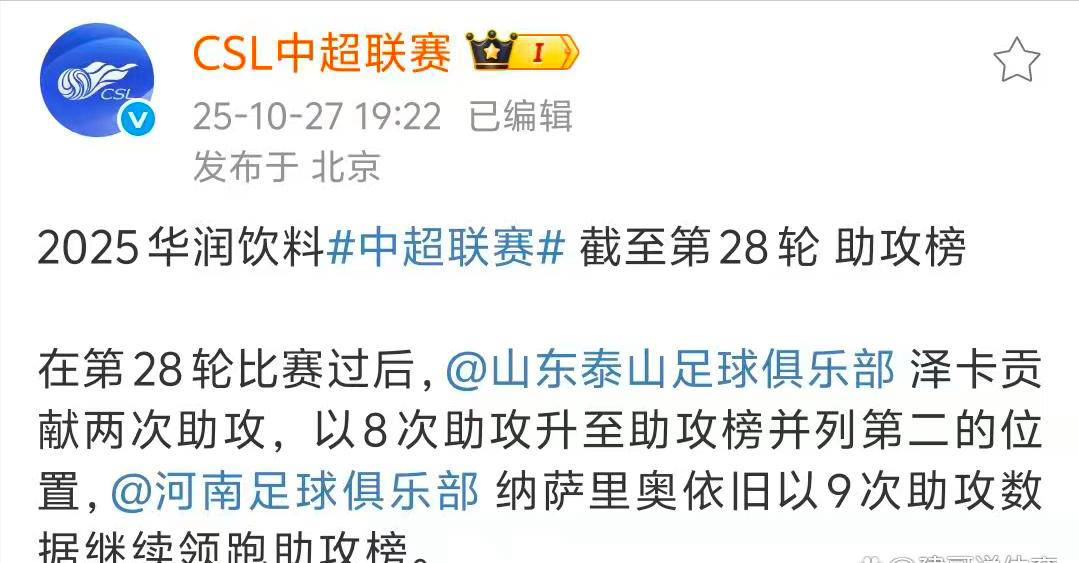北京时间10月27日,山东泰山队的外援高中锋泽卡凭借出色的身体条件,在两次关键进球中功不可没。他在一场比赛中有两次助攻,令他本赛季的助攻次数达到8次,位列中超助攻榜第二,因此受到了中超联赛官网的表扬。官网指出,泽卡距离目前的中超助攻王纳塞里奥仅差1次。