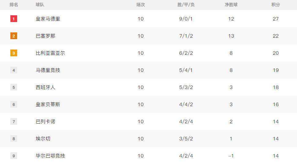 马德里竞技2-0战胜贝蒂斯后升至第四位,目前以5胜4平1负积19分。 西班牙人同积18分,因净胜球劣势排名第五。中游球队中,皇家贝蒂斯(16分)、巴列卡诺(14分)、埃尔切(14分)和毕尔巴鄂竞技(14分)积分接近,竞争激烈。降级区方面,皇家奥维耶多和赫罗纳同积7分,深陷保级泥潭。 塞尔塔、奥萨苏纳和莱万特等同处积分榜下游位置。