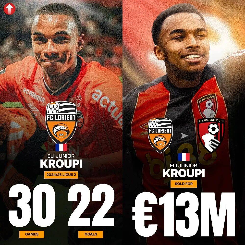 如今,19岁的法国前锋克鲁皮很可能会沿着前辈们的脚步,成为伯恩茅斯下一位走向豪门的球员。克鲁皮在2025年2月以1300万欧元的价格从法乙洛里昂转会加盟伯恩茅斯,夏天正式加入球队。自加盟以来,他的表现引人注目,最近三次英超出场便攻入4球,状态火热。