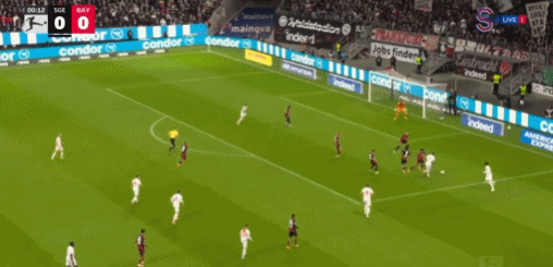 下半场,拜仁依然不断创造机会。第54分钟,凯恩射门,球击中了立柱。随着比赛不断推动,法兰克福加强了攻势,想挽回败局。第84分钟,格雷罗在后场断球后发动反击,把球斜传给从左路插上的迪亚斯,迪亚斯加速甩开了防守球员,小角度爆射破门,比分变成3,-,0!