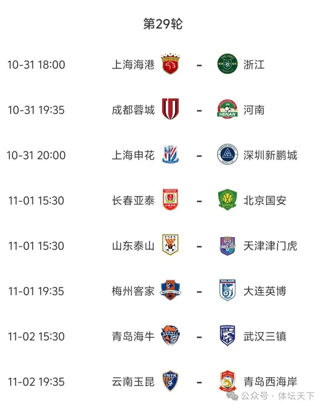 青岛海牛后两轮主场对阵武汉三镇,客场对阵浙江队,梅州客家后两轮主场对阵大连英博,客场对阵北京国安,长春亚泰后两轮主场对阵北京国安,客场对阵青岛西海岸。为了保证公平,前几个赛季中超最后两轮都同一时间开打,欧洲各大联赛也是如此,但今年居然不是。