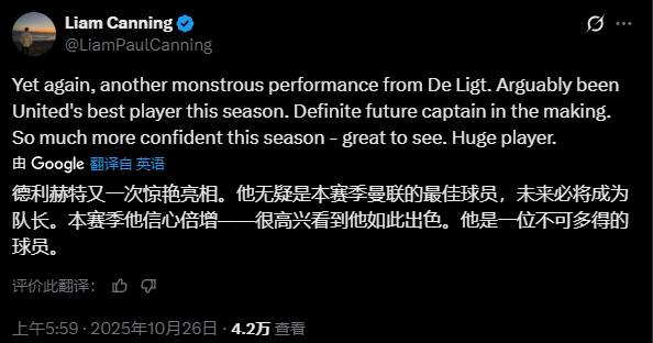 近日,曼联球迷及内容创作者利亚姆·坎宁(Liam Caning)提出了一个新视角,他认为德里赫特这位比B费年轻五岁的后卫,已经展现出足够的潜力,成为曼联未来的核心人物。坎宁称德里赫特为“如怪兽般强悍”的球员,并认为他是“曼联本赛季最佳球员”,还表示他完全有能力成为“未来队长”。