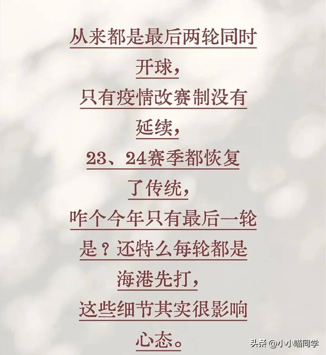 我想问问,中国足协或者中足联,到了如此关键的时刻,比赛的这种安排究竟是出于什么考虑?首先,为什么以往传统的倒数第二轮总是同时开球,而今年却没有延续这个做法?其次,为什么最近的赛程安排中,海港、蓉城、申花三队的比赛时间总是错开,且是轮流先踢?第三,为什么这种错开的赛程安排会影响心态?实际上,后踢的队伍常常会受到前场比赛结果的影响,这样的差异对比赛产生了重要影响。而其中的关键在于“我只能赢”和“我赢了就能第一”这两种心态的区别。想一想,这两者之间的不同感受,是不是在潜移默化中影响着球员和球队的表现?