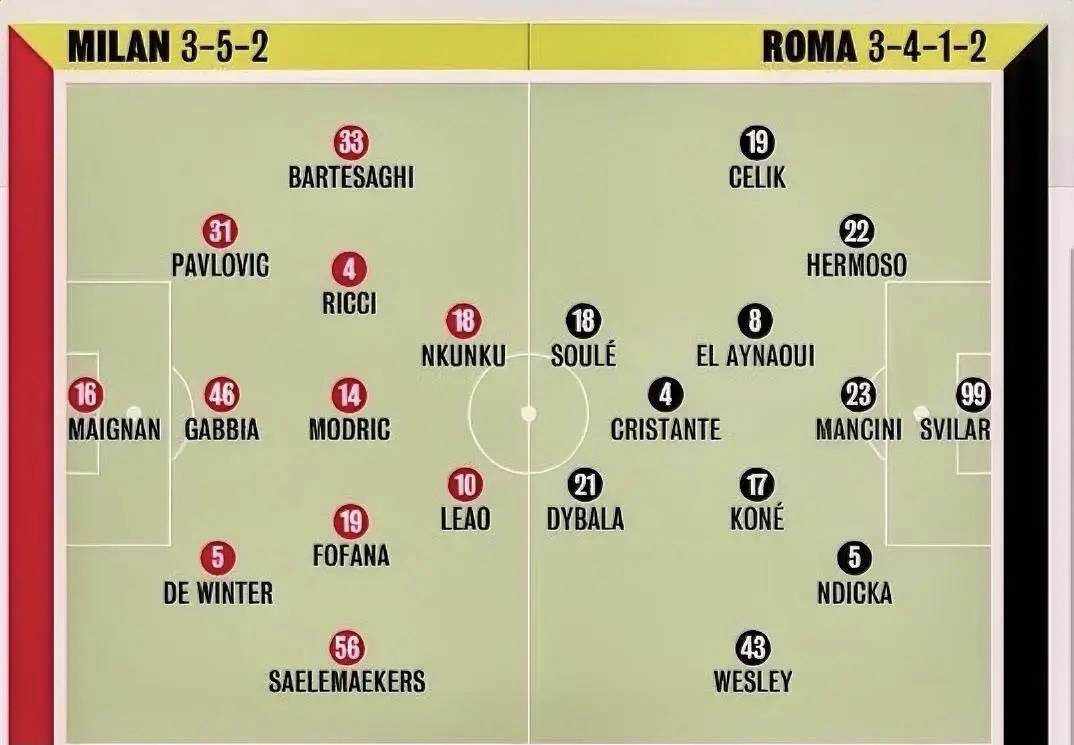 米兰与罗马之战最终阵容公布!由于莱奥的及时伤愈复出,米兰阵容重新回到球队熟悉的352,同时膝盖挫伤的托莫里也摆脱了伤病,他会在米兰与罗马之战出现在替补席,同样长期缺阵的加沙里也回到了球队,奇克、埃斯图皮尼安作为替补随时准备出场,最近几轮比赛米兰替补席从来没那么富裕过。