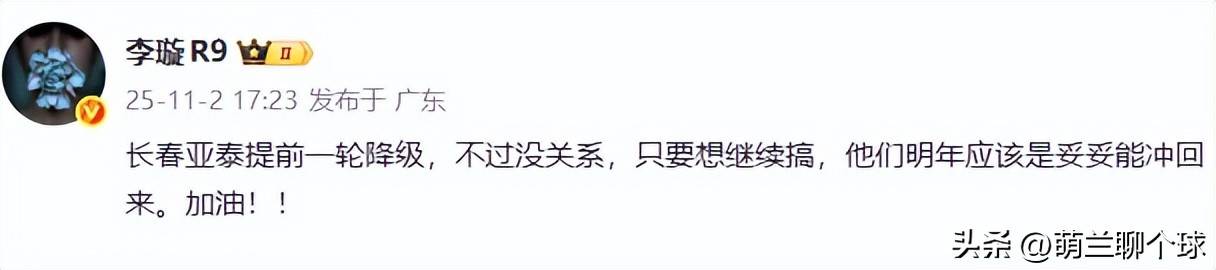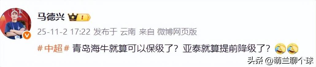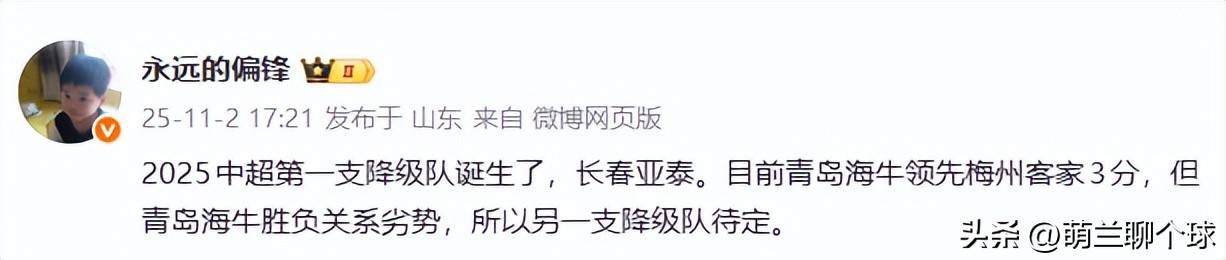 比赛结束后,各路足球媒体人也纷纷发表了自己的看法。记者陈永直言:“2025中超第一支降级队诞生了,长春亚泰。目前青岛海牛领先梅州客家3分,但青岛海牛胜负关系劣势,所以另一支降级队待定。”名记李璇则鼓励长春亚泰:“长春亚泰提前一轮降级,不过没关系,只要想继续搞,他们明年应该是妥妥能冲回来。加油!”而体坛老记马德兴则显得有些谨慎:“青岛海牛就算可以保级了?亚泰就算提前降级了?”