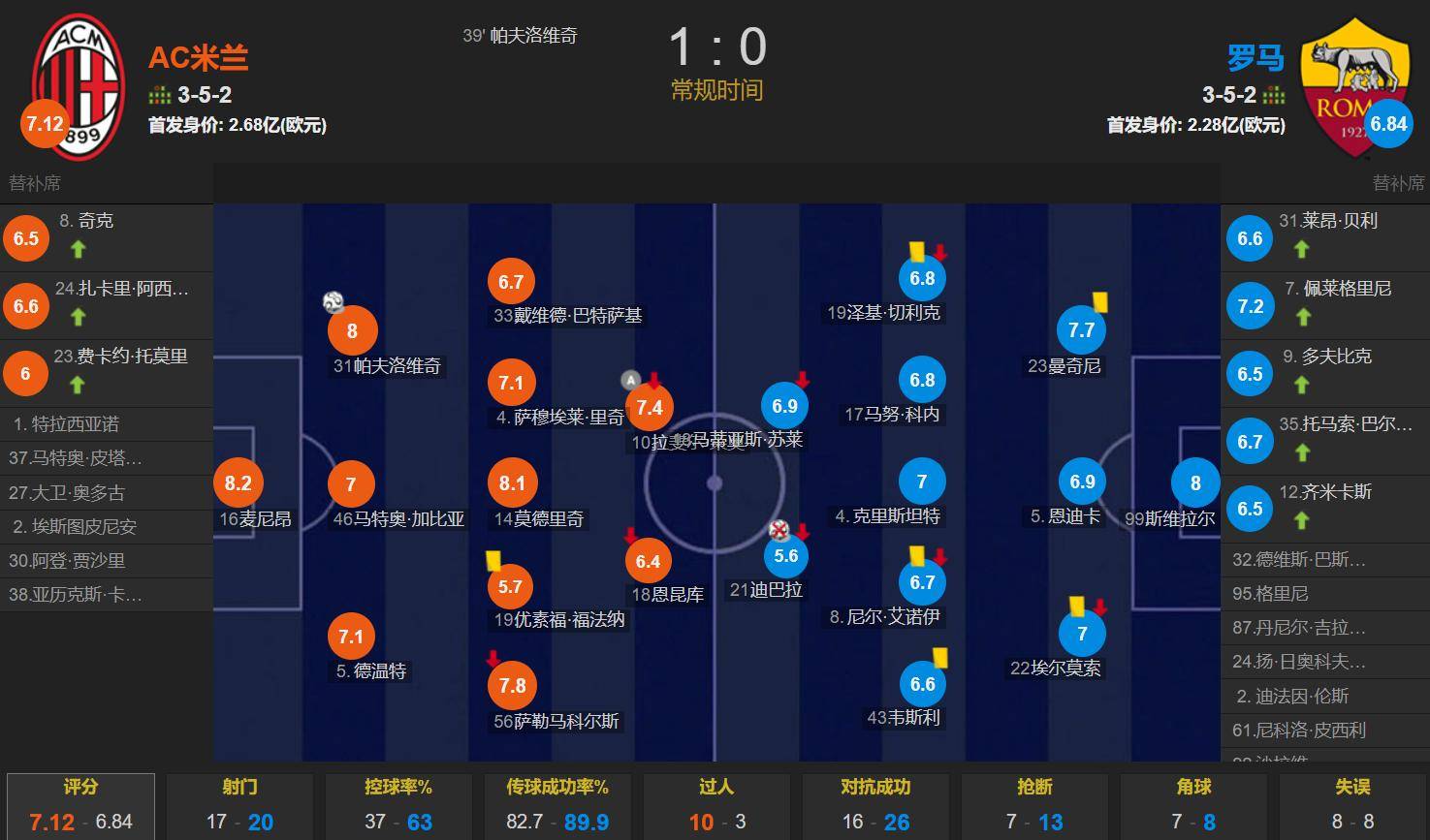 此役AC米兰在主场面对罗马没有任何优势可言,米兰的控球率仅为37%,射门比17-20。米兰赢球的最大功臣是球队的法国门将迈尼昂,此役他做出了7次扑救,更是在比赛第82分钟扑出了罗马阿根廷攻击手迪巴拉的点球,迈尼昂直接将迪巴拉主罚的点球扑出了底线,罗马连补射的机会都没有捞到。赛后,迈尼昂获得全场最高的8.2分,第二高分是8.1分的足坛活化石、四十不惑的莫德里奇,家有门闩+一老,真是如获二宝。迈尼昂还当选了AC米兰1-0罗马的队内最佳球员!