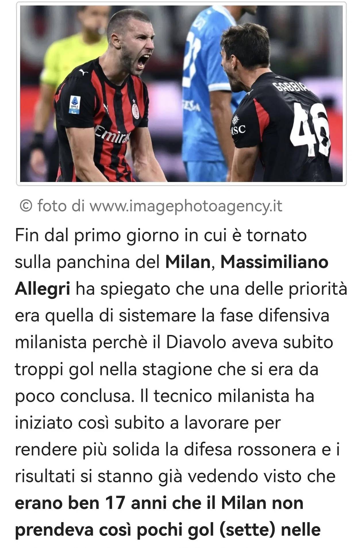 正如《米兰体育报》今日报道的那样,最令人印象深刻的是,阿莱格里沿用了上赛季表现令人失望的后防线组合——即菲卡约·托莫里、马特奥·加比亚和斯特拉希尼亚·帕夫洛维奇。这三名球员均实现了蜕变,表现大幅提升,这得益于这位来自利沃诺的主帅(阿莱格里)的精心打磨,他将上赛季漏洞百出的防线打造成了坚固堡垒。加比亚已成为阿莱格里治下米兰的绝对主力,在本赛季意甲中从未被换下,始终首发出场。米兰全队中,唯有他打满了本赛季至今的全部900分钟联赛。