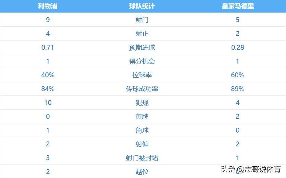 数据统计显示,上半场利物浦射门9-5、射正4-2,控球率方面,皇马60%倒是领先,利物浦队的进攻整体上更有威胁。