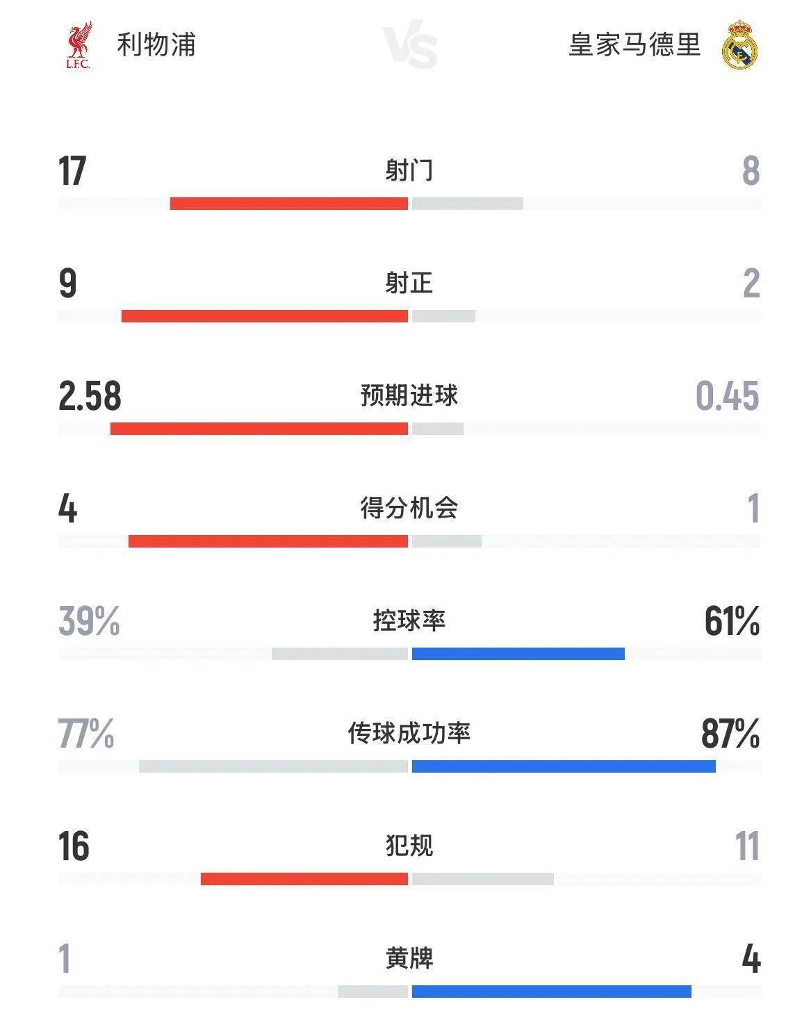 而利物浦则用39%的控球率,创造了9次射正的辉煌战绩,其预期进球值高达1.66,完全碾压了皇家马德里仅为0.85的预期进球值。