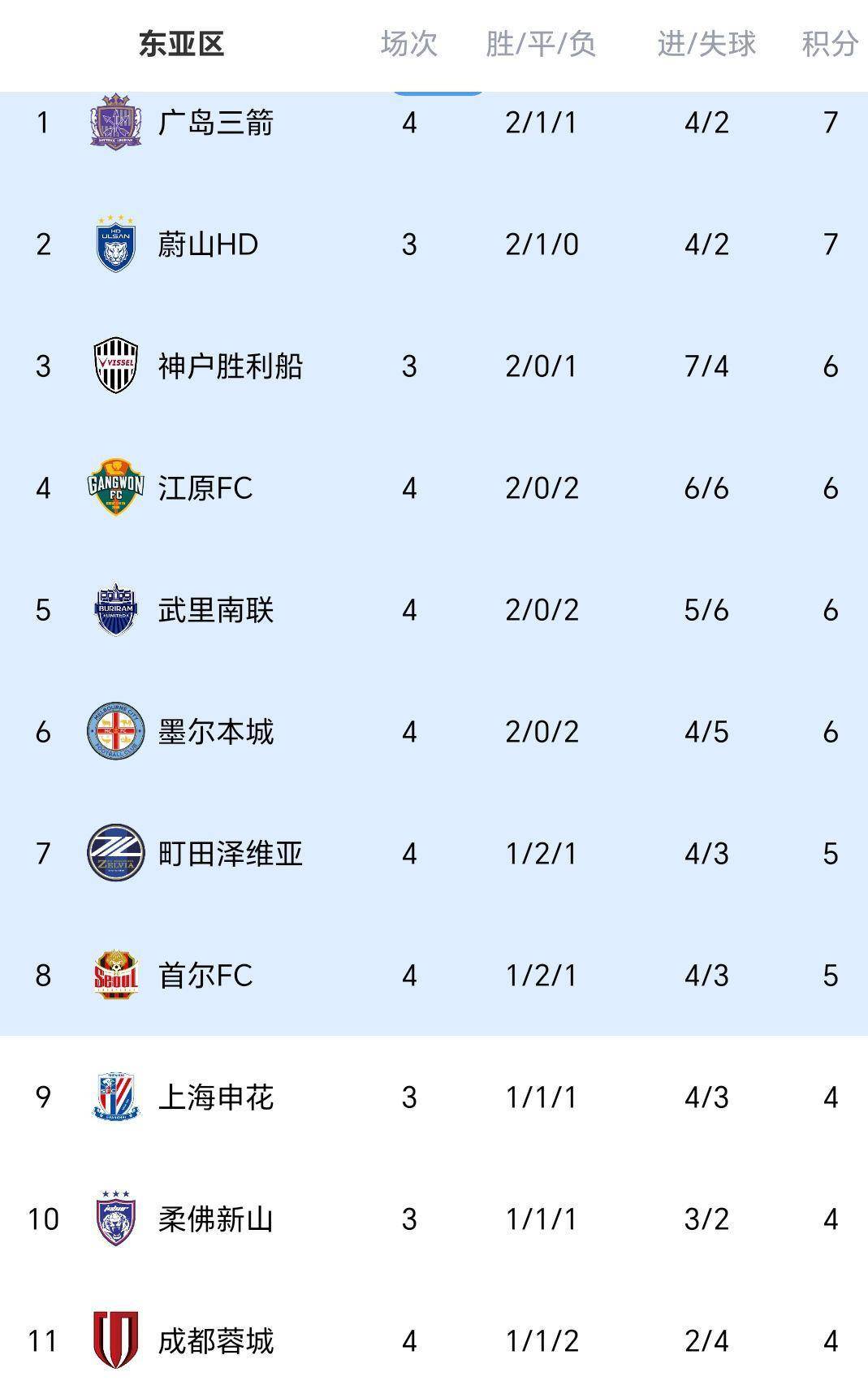 本轮结束后,亚冠东亚区积分榜呈现“东亚围剿中超”的格局。 蔚山HD、广岛三箭同积7分领跑,日本球队神户胜利船、町田泽维亚均位居前八。 而中超三支球队全部跌出晋级区:上海申花少赛一场积4分排名第9,成都蓉城第11,上海海港第12名垫底。
