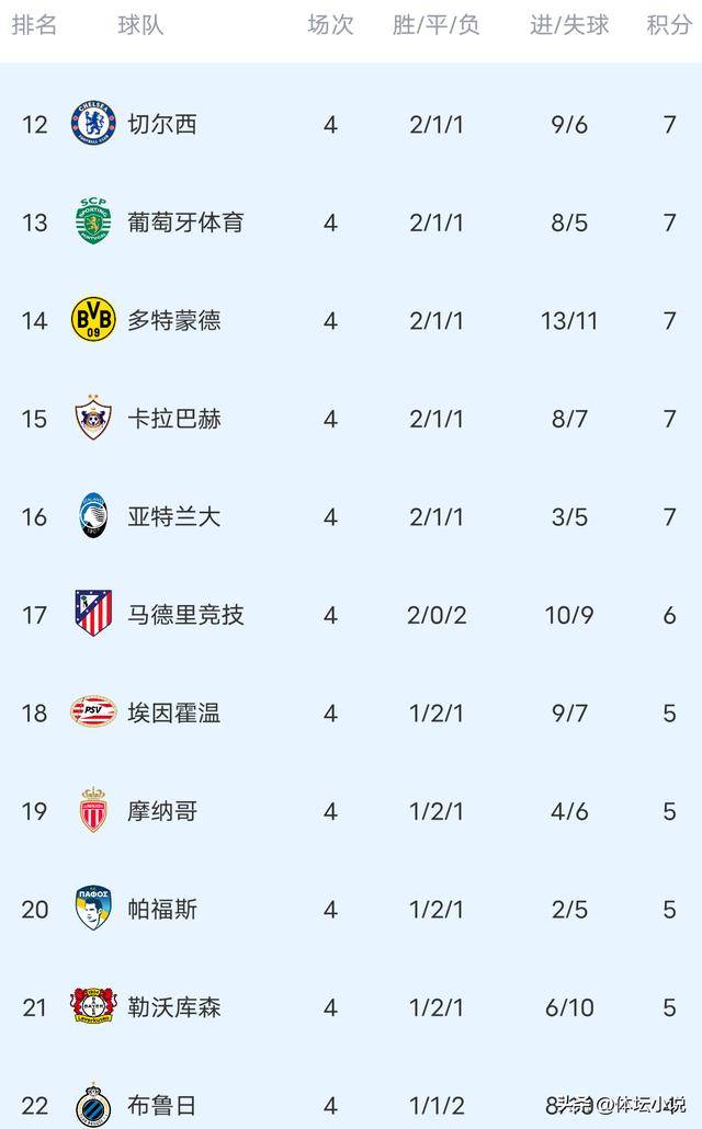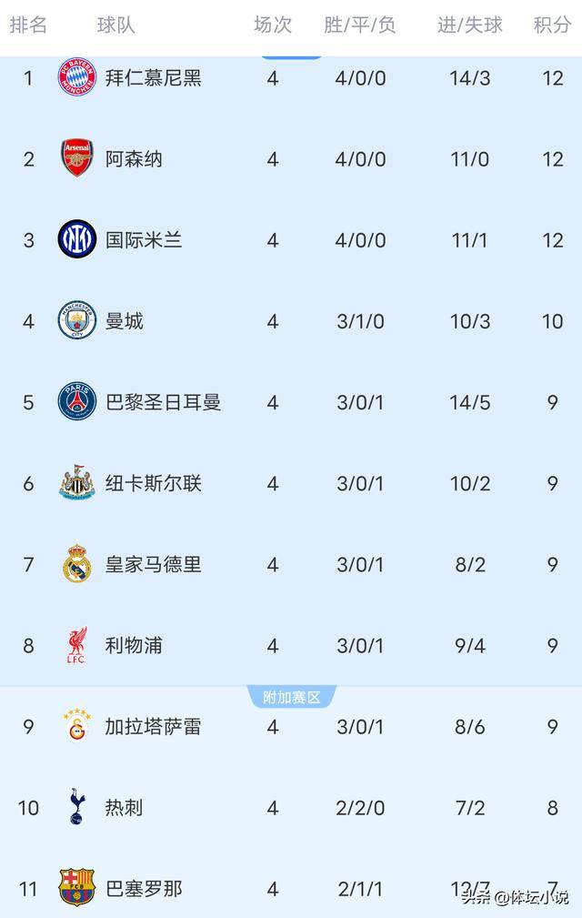 北京时间11月6日,欧冠联赛第四轮结束,在最新结束的几场对决中,切尔西2-2爆冷与鱼腩卡拉巴赫握手言和,曼城火力全开4-1打爆德甲劲旅多特,国米虽然状态不佳仍以2-1险胜鱼腩阿拉木图凯拉特,巴萨则是3-3被弱旅布鲁日爆冷,这样一来最新的积分榜已经更新,国米4连胜第三,曼城4轮不败第四,巴萨排名第11位!
