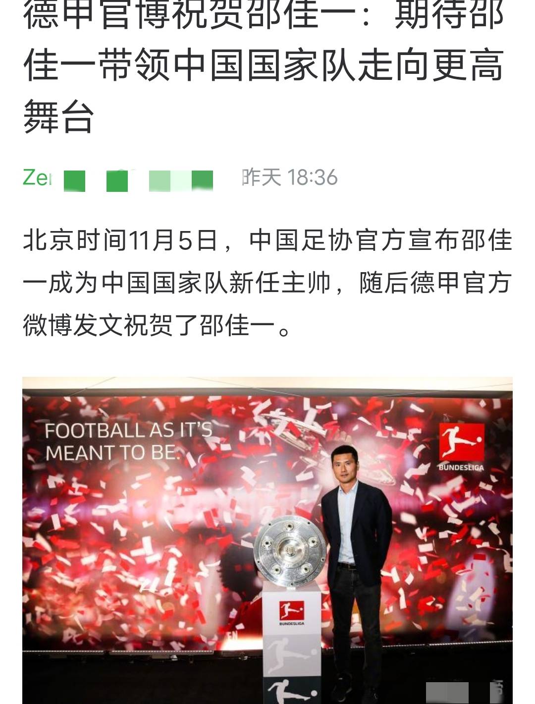 在邵佳一成为中国国家队主教练的消息公布后,德甲职业足球联盟和德国足协纷纷发文表示祝贺。德国足协在声明中表示,邵佳一曾效力于德甲的慕尼黑1860、科特布斯以及德乙的杜伊斯堡等队,他在德国足球的职业生涯长达9年,并且凭借出色的表现入选了德国足球名人堂。德国足协认为邵佳一出任中国队主教练是德国足球的荣耀,并表示如果需要,他们将为邵佳一提供一切支持,帮助他带领中国队走向更高的舞台,预祝邵佳一执教顺利。