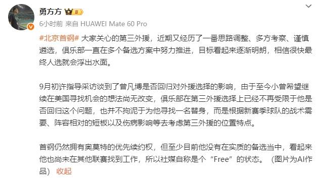 另外勇方方还谈到了北京男篮上个赛季的锋线外援奥莫特,因为如果曾凡博不回来的话,北京男篮基本上就会选择一名锋线外援,很多球迷都会想到上个赛季在球队效力的奥莫特。不过据勇方方透露,北京男篮虽然对奥莫特使用了优先续约权,奥莫特至今还没有签约,但他并不在北京男篮的备选中。也就是说,北京男篮已经确定不会再和奥莫特续约。这样来看的话,北京男篮在外援选择方面应该是已经有了更加合适的人选。整体来看的话,虽然曾凡博无法回归肯定会给北京男篮的实力造成一些影响,不过球队的整体实力不错,特别是在今年夏天引入了赵睿后,整体实力又有了提升,新赛季的表现还是非常值得期待的,依旧是夺冠的大热门!