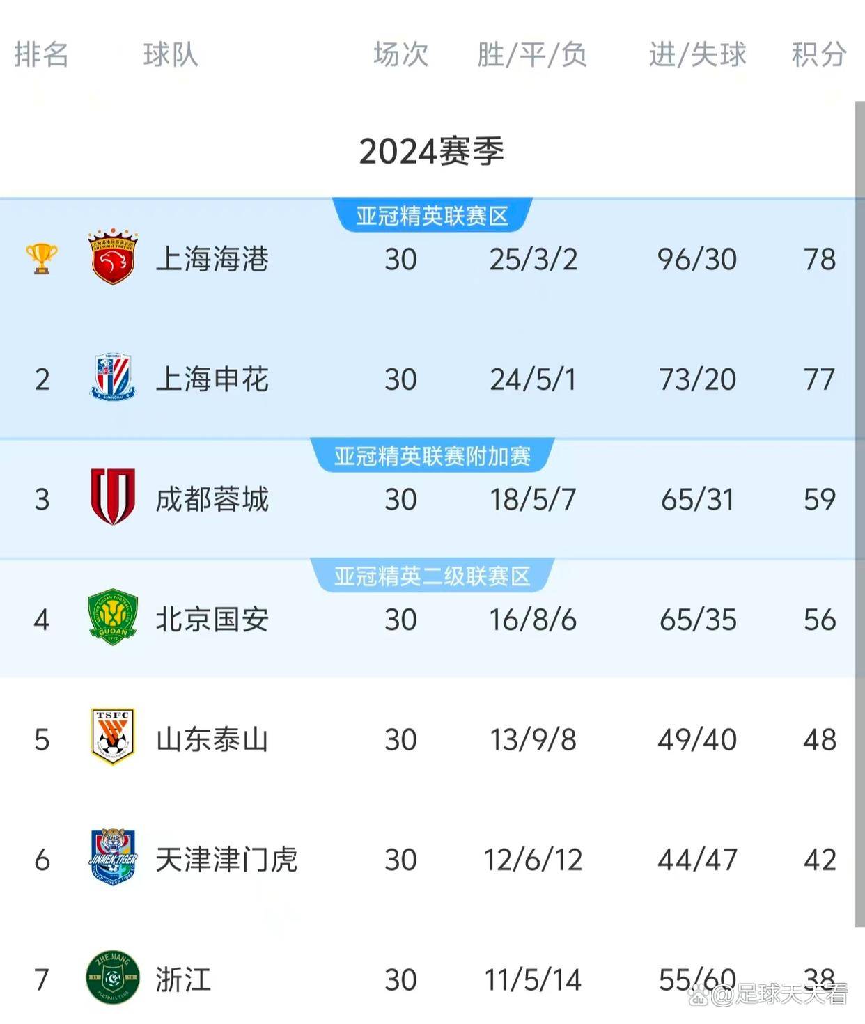 更有趣的是,上赛季中超的最终排名与本赛季前七名的排名竟然惊人地一致:上海海港夺冠,上海申花第二,成都蓉城第三,北京国安第四,山东泰山第五,天津津门虎第六,浙江队第七。除了上海双雄的积分差距较大外,其余球队之间的差距并不明显。成都蓉城去年积59分,今年在还剩一轮的情况下,积分依然是59分。尽管本赛季成都蓉城一度给人以争冠希望,球队看似进步明显,但仔细分析,其实力与去年相比并没有本质上的提升。