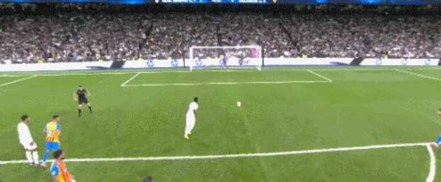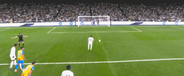 比赛开始后,第15分钟,姆巴佩在禁区内被瓦伦西亚的防守球员抱住倒地,同时贝林厄姆也在另一侧被推倒。主裁判通过VAR回放后改判为点球,随后姆巴佩主罚命中,帮助皇马1-0领先。