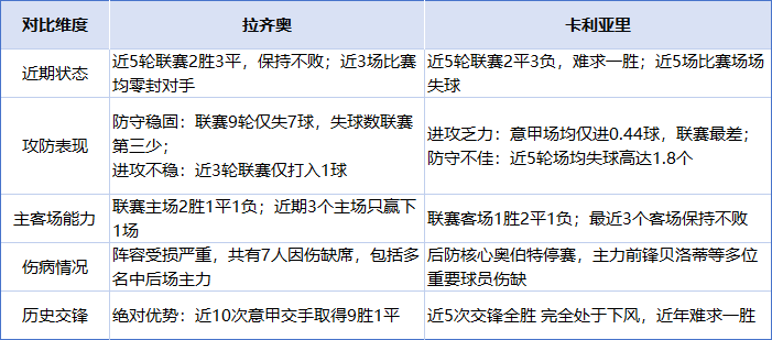 · 卡利亚里客场韧性:尽管卡利亚里整体状态不佳,但他们在客场近期保持了不败战绩,显示出了一定的韧性,可能会给拉齐奥制造一些麻烦。
