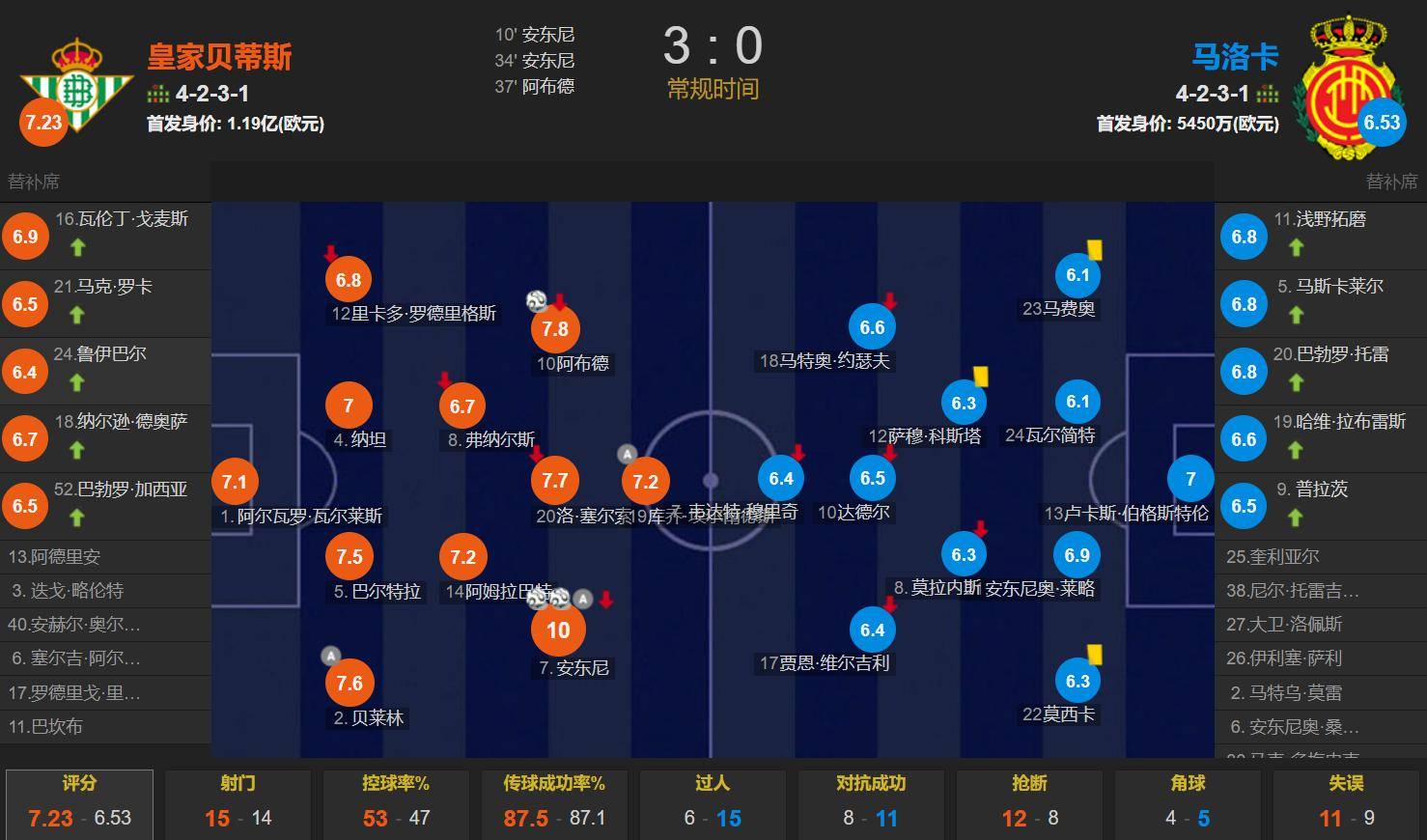 在西甲第11轮的比赛中,皇家贝蒂斯主场迎战马洛卡,佩莱格里尼派出了4231阵型,球队的首发身价达到1.19亿欧元,安东尼继续占据右边锋的位置;马洛卡同样采用4231阵型,首发身价为5450万欧元。