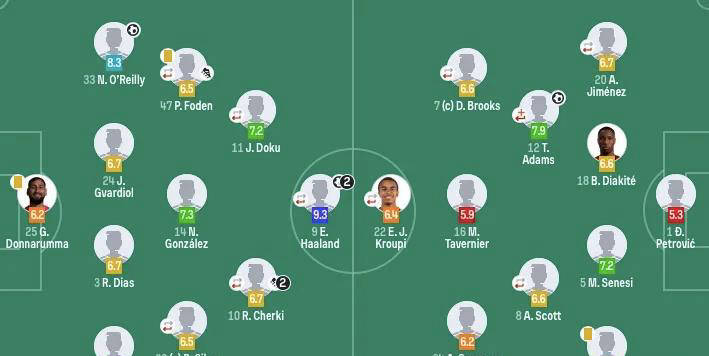 在比赛关键时刻,第17分钟,谢尔基传中,哈兰德面对门将单刀破门,帮助曼城取得了领先。第26分钟,多纳鲁马失误导致亚当斯进球,伯恩茅斯扳平比分。第33分钟,谢尔基再次助攻,哈兰德单刀梅开二度,曼城重新取得领先。