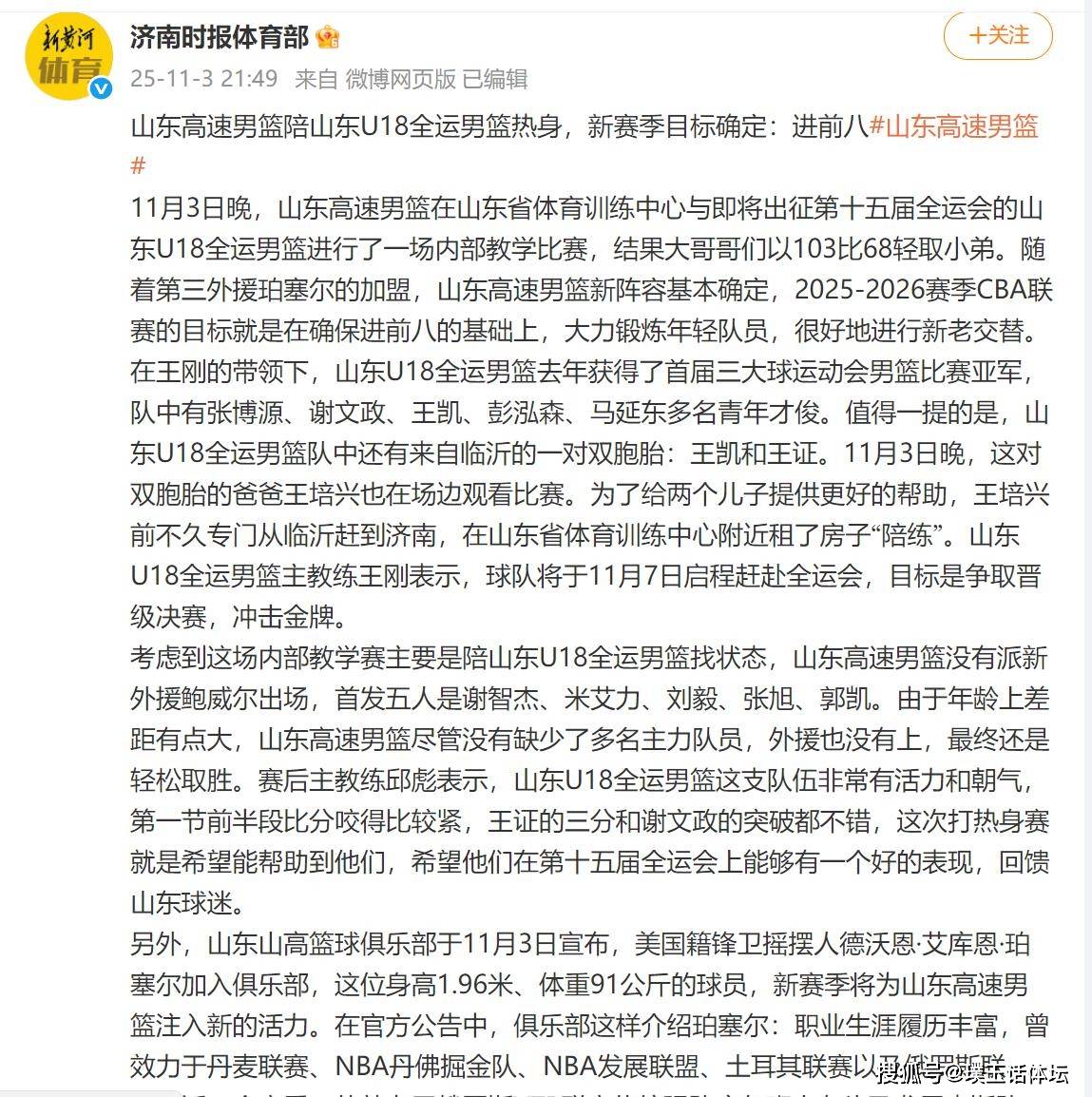 北京时间11月4日,我们继续分享国内篮坛。目前距离CBA新赛季还有一个多月的时间,各支球队都在积极做着准备。由于目前正是全运会决赛阶段的比赛,因此对于各支球队来说,人员也是不齐整。而在3日,山东高速男篮在省体育中心与即将出征的山东U18全运男篮进行了一场内部教学赛。可以说,这也是一场以大打小的比赛。经过四节比赛的角逐,山东高速男篮以103比68,轻取山东U18队。
