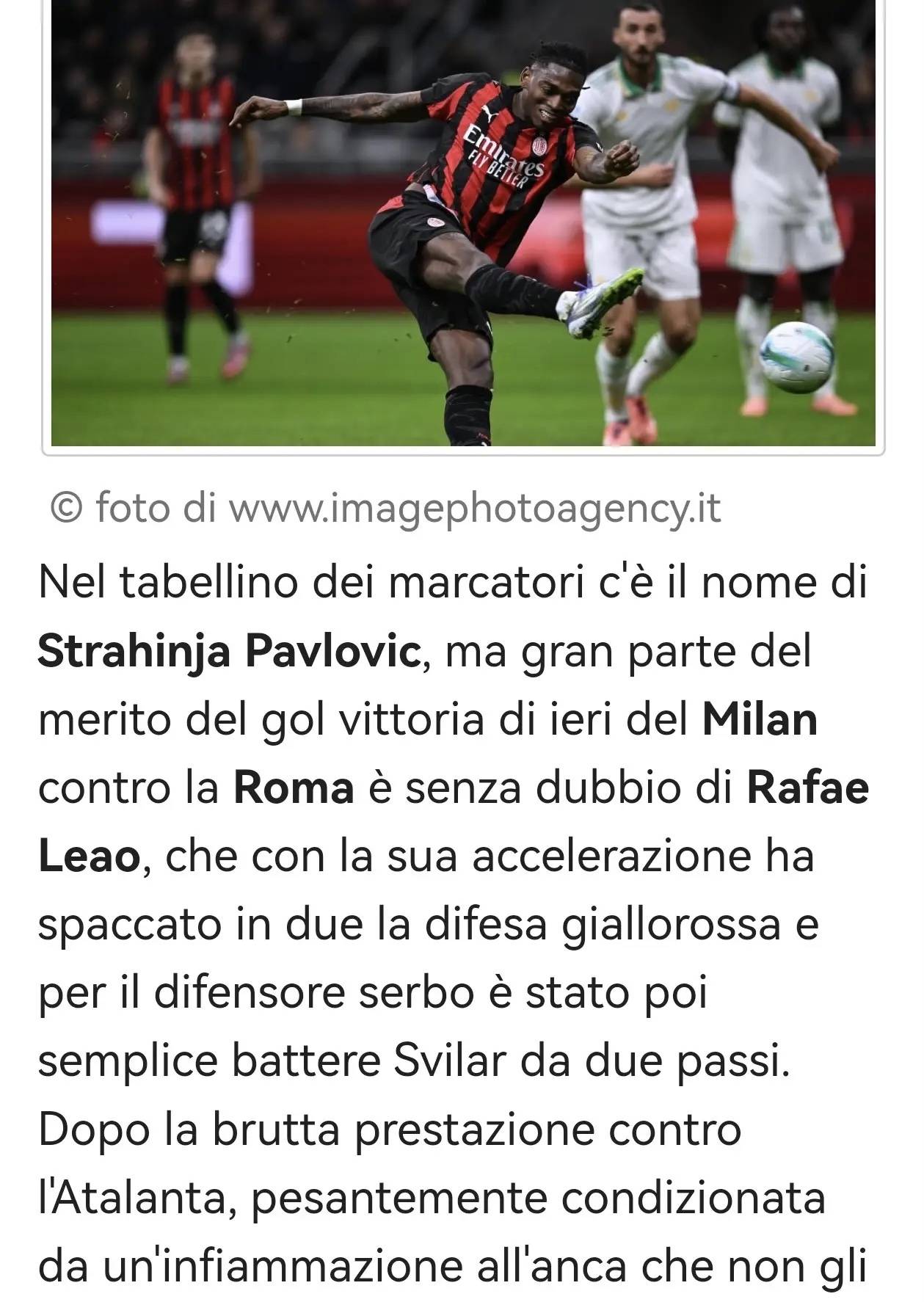 进球功臣一栏写着斯特拉希尼亚·帕夫洛维奇的名字,但米兰昨晚击败罗马的制胜球,很大程度上要归功于拉斐尔·莱奥——他凭借一次高速突破撕开罗马防线,随后塞给塞尔维亚后卫的传球,让后者在距门将斯维拉尔两米处轻松破门。此前对阵亚特兰大时,莱奥因髋部炎症状态不佳,无法尽情冲刺,而如今这位葡萄牙球员终于重返巅峰状态。