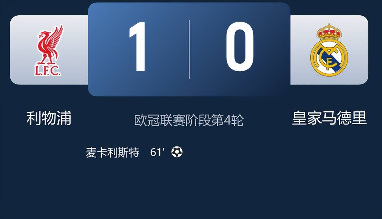 结果利物浦坐镇安菲尔德球场迎战皇马。上半场索博斯洛伊失单刀,琼阿梅尼禁区内手球,VAR介入主裁判没有判罚点球,库尔图瓦屡献神扑,上半场利物浦就压制了皇马;下半场麦卡利斯特头球破门,最终利物浦1-0皇马,后者吃到本赛季欧冠首败。