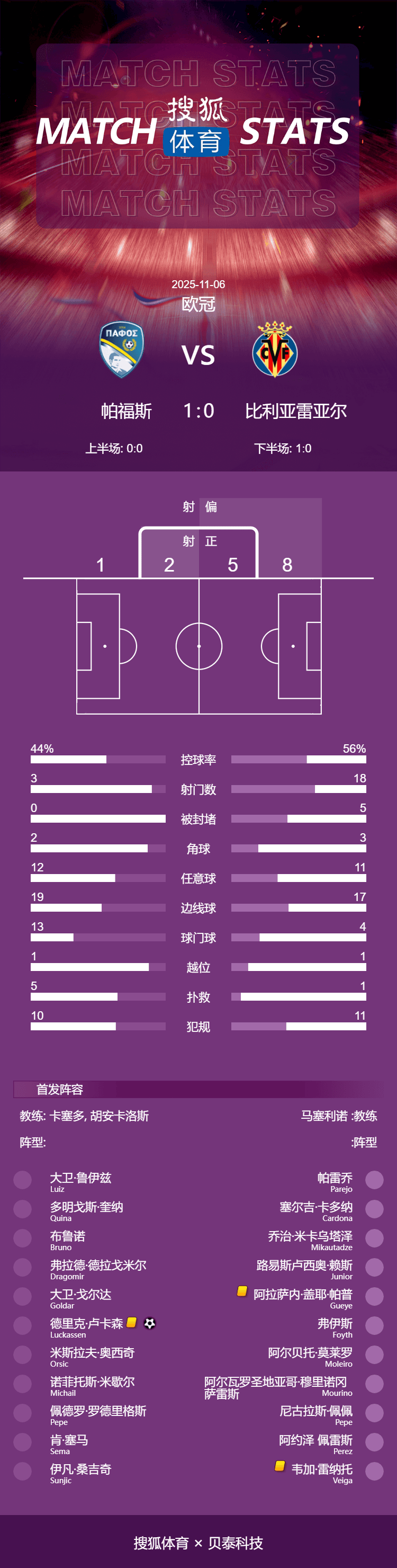 北京时间11月6日消息,2025-26赛季欧冠联赛阶段第四轮,欧冠新军、塞浦路斯球队帕福斯主场1-0比利亚雷亚尔,拿到队史欧冠正赛首胜。