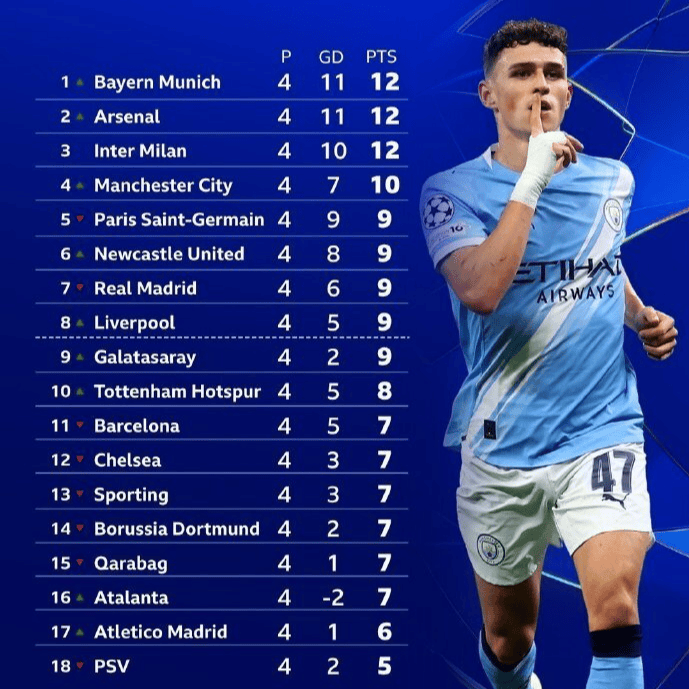 至目前为止,欧冠小组赛已进行4轮,英超的6支球队中有5支跻身积分榜前10名。其中,阿森纳以4连胜的佳绩高居第2,曼城排名第4,纽卡斯尔和利物浦分别位居第6和第8,4队的表现都非常稳健,暂时都处于直通淘汰赛的区间。