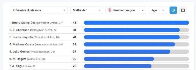 据数据统计显示,库尼亚本赛季英超已赢得39次进攻对抗。