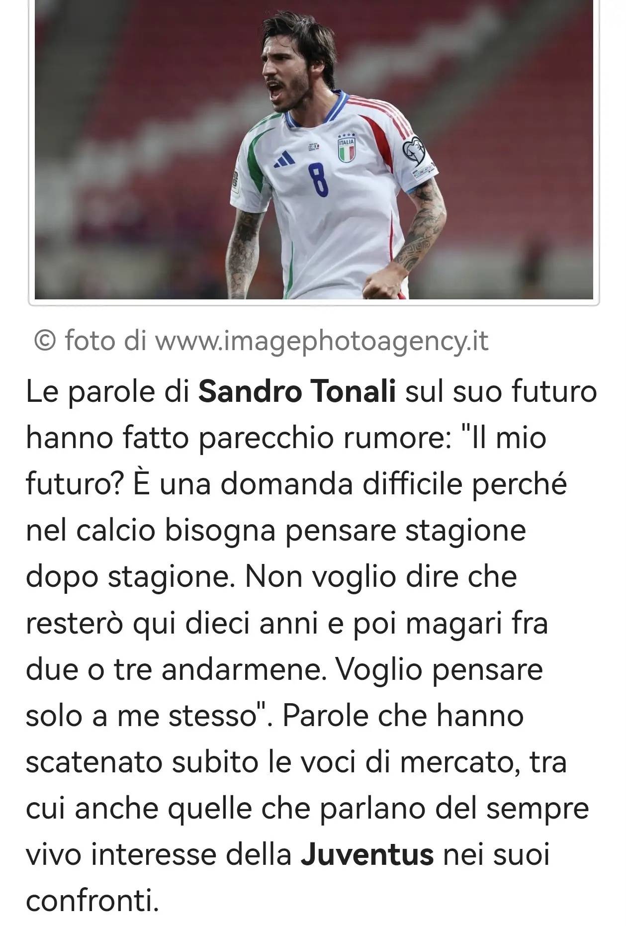 桑德罗·托纳利关于自己未来的言论引发不小热议:“我的未来?这是个很难回答的问题,因为在足球界,只能一个赛季一个赛季地规划。我不会说自己会在这里待十年,也不会说两三年后可能离开。我只想专注于当下的自己。”目前他与纽卡的合同是2030年到期!这番话随即引发了诸多转会传闻,其中就包括尤文图斯对他持续不减的兴趣。
