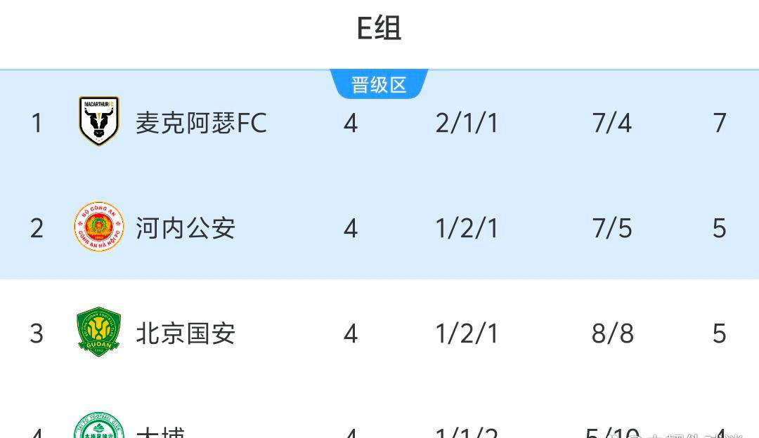 目前,小组排名上,北京国安凭借这场胜利脱离了垫底之苦,与河内公安同积5分,但因净胜球劣势而位列第三,将大埔队挤至小组最后。而麦克阿瑟FC凭借两胜一平的战绩,以7分暂居榜首。