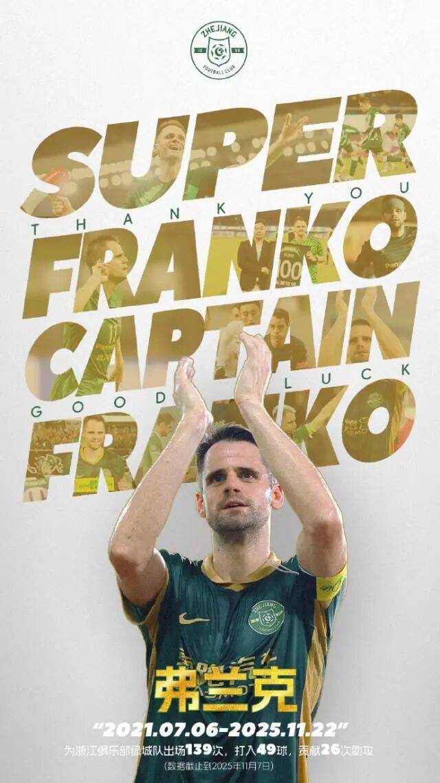 弗兰克在浙江俱乐部绿城队的时光即将落幕,但他在浙里写下的故事,将成为浙江足球永恒的财富。Super Franko,Captain Franko,谢谢你。